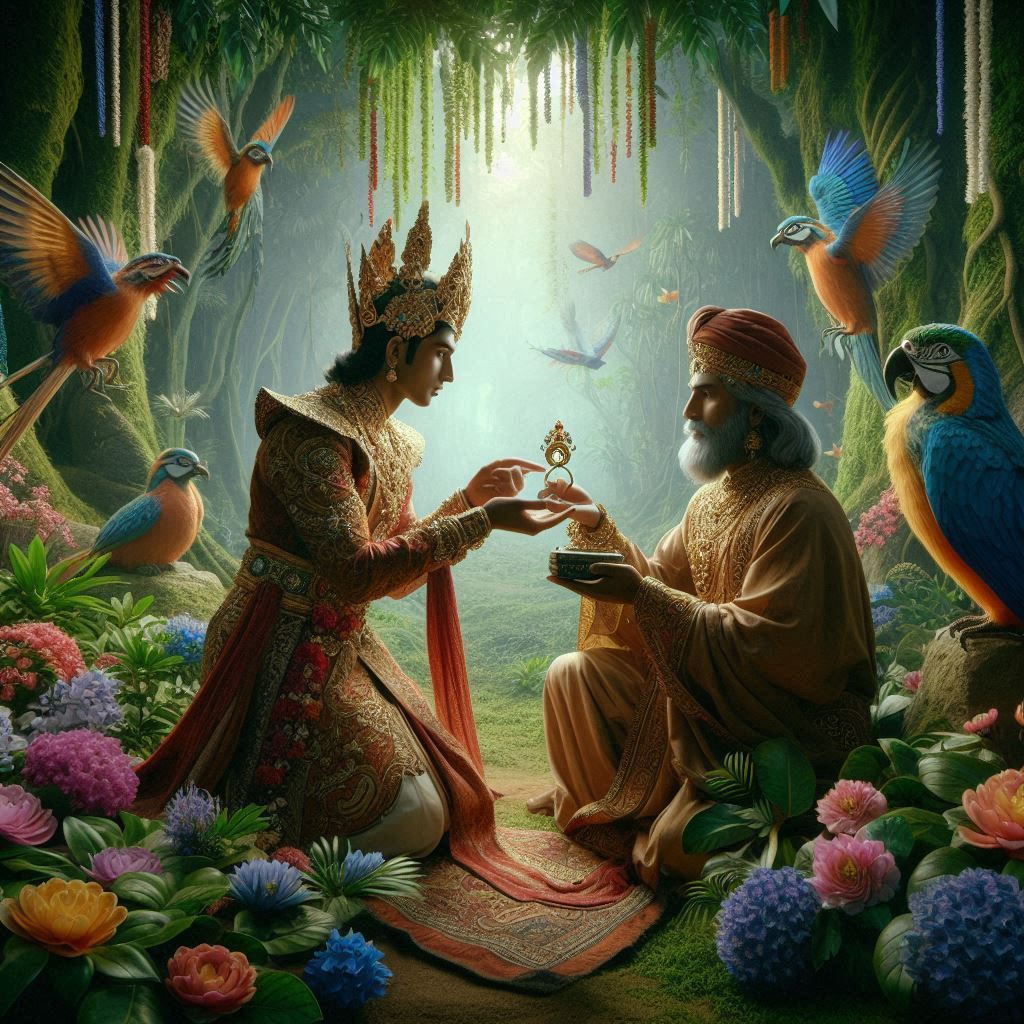 अचानक, तिथे एक साधुपुरुष आला.राजपुत्राचे त्याच्याकडे लक्ष जाताच, त्याने त्यांना नमस्कार केला.साधुने राजपुत्राला आशीर्वाद दिला. त्याचा उजवा हात हातात घेऊन साधुने राजपुत्राच्या बोटात एक अंगठी घातली आणि त्याचा हात सोडून तो साधु माघारी वळला. बघता बघता बाजूच्या घनदाट वनराजित दिसेनासा झाला.साधुचे असे अचानक येणे आणि अचानक जाणे,राजपुत्राला कोड्यात टाकून गेले.