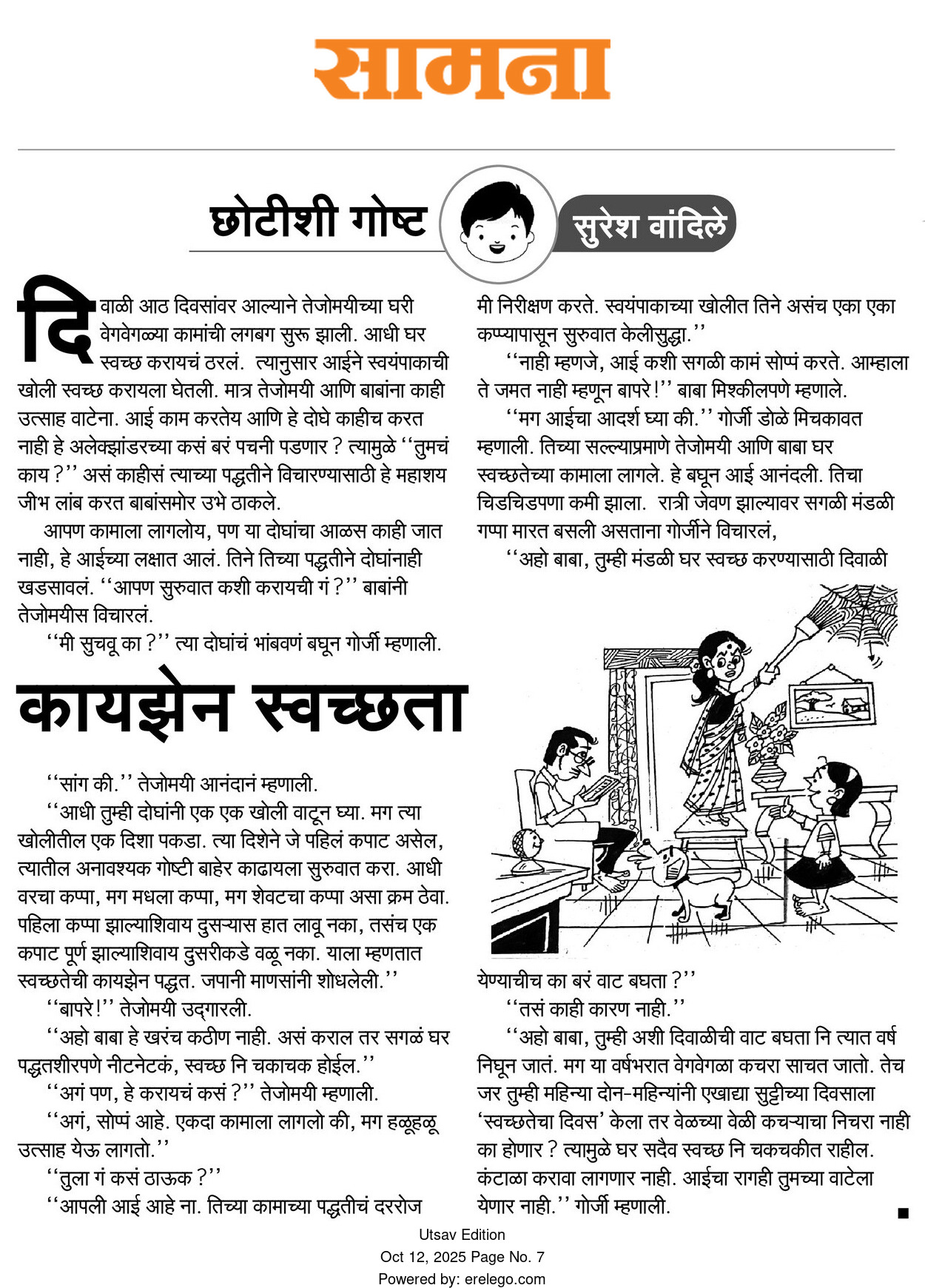 “अहो बाबा, तुम्ही अशी दिवाळीची वाट बघता नि त्यात वर्षं निघून जातं. मग या वर्षभरात वेगवेगळा कचरा साचत जातो. तेच जर तुम्ही महिन्या दोन-महिन्यांनी एखाद्या सुटिच्या दिवसाला, ‘स्वच्छतेचा दिवस’ केला तर वेळच्यावेळी कचऱ्याचा निचरा नाही का होणार? त्यामुळे घर सदैव स्वच्छ नि चकचकित राहील. असं मग दिवाळीच्या काळात सगळी कामं अंगावर पडणार नाहीत. कंटाळा करावा लागणार नाही. आईचा रागही तुमच्या वाटेला येणार नाही.” गोर्जी म्हणाली.