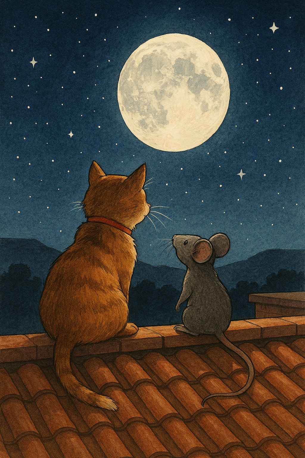 मार्गारेट मांजर मावशी आणि रॉबिन्सन उंदीर मामा या दोघांना रात्री चंद्रदर्शन करायला फार आवडायचं. मालकीनबाई झोपल्या की दोघं हळूच खिडकीतून बाहेर पडत नि टेरेसवर जाऊन चांदोबाकडे टक लावून बघत. चांदोबावर जाता आलं तर काय धम्माल येईल असं रॉबिन्सनला नेहमी वाटे. तो प्रत्येक वेळी मार्गारेट मावशीला याविषयी बोलायचा. मावशी मात्र त्याच्या इच्छेला हसण्यावारी न्यायची. तिचं एकच पालूपद,
