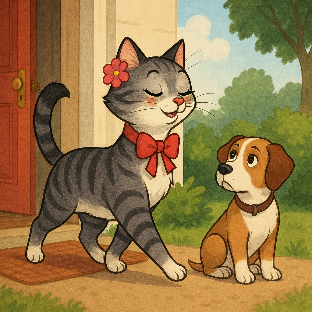 आईबाबा कधी ऑफिसला जातात याची वाट पुसी कॅट बघतच होती. ते जाताच तिने शेपूट वर आपला आनंद व्यक्त केल नि मग तिची लगबग सुरु झाली. घरातून बाहेर जाण्यासाठी तिने छान छान तयारी सुरु केली.नटली.थटली. आरशात बघून स्वत:वरच खुष झाली.हे सगळं रोनाल्डो डॉगी बघत होता.आईबाबा गेले की ही बया अशीच बाहेर पडते हे त्याला स्वानुभवारुन ठाऊक झालं होतं.त्यामुळे तो तिच्याकडे दुर्लक्षच करायचा.पण आज जरा बाईसाहेब जास्तच नटल्याचं त्याच्या लक्षात आलं.त्यामुळे न राहवून त्याने पुसीला टोकलंच शेवटी,