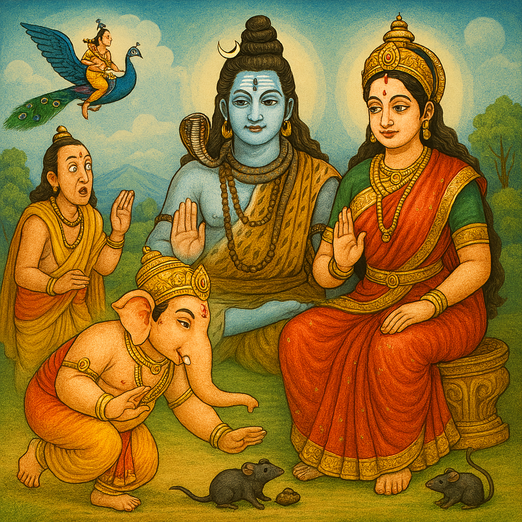 कार्तीकस्वामी, त्यांचं वाहन असलेल्या मोरावर बसून कधीचेच खूप दूर निघून गेले होते. बाप्पांचं वाहन असलेले मूषकस्वामी मोदकावर ताव मारत होते. हा जाणार कधी आणि पृथ्वीला प्रदक्षिणा मारणार कधी? तिघांनाही प्रश्न पडला. अखेरीस नारदांनी न राहवून विचारलच…
