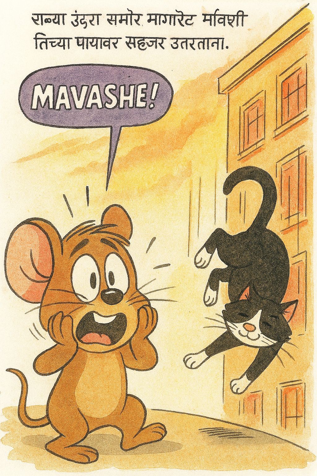 “शिवाय, आमच्या हाडाचा सांगाडाही खास अशा प्रकारे बनलेला असतो. आमच्या पाठीचा कणा लवचिक असतो. मानवास जसं कॉलरबोन म्हणजे गळ्यातलं हाड असत, तसं आम्हाला नसतं. त्यामुळे आम्ही हवा तसा आमचा घाट बदलू शकतो. त्यामुळे कुणी आम्हाला उंचावरुन फेकलं तरी आम्ही हवेतच आमचा मोहरा बदलवू शकतो. खाली पडताना आम्ही ते चटदिशी करतो. त्यामुळे खाली पडतो तेव्हा आम्ही पडलेलो नसतो तर चार पायावर अलगद उतरलेलं असतो.” मार्गारेट मावशी शेपटी फेंदारून म्हणाली.
